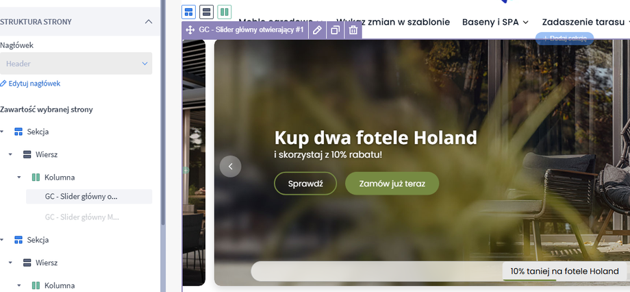 - Znajdź moduł "GC - Slider główny otwierający" - zazwyczaj jest na samej górze strony głównej