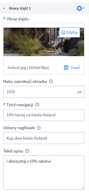- Obraz slajdu - kliknij "Wybierz plik" i wgraj swoją grafikę